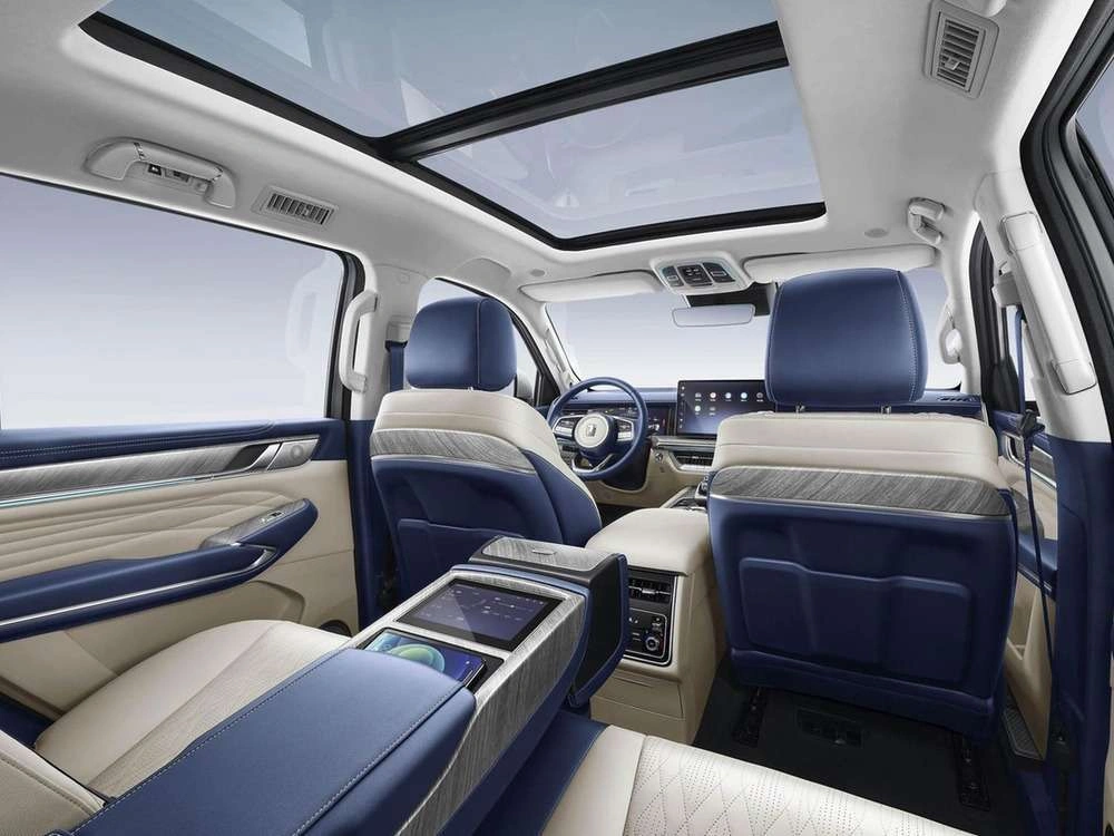 - Центральный подлокотник сидений заднего ряда с подстаканниками, отсеком для хранения и сенсорным экраном управления функциями автомобиля